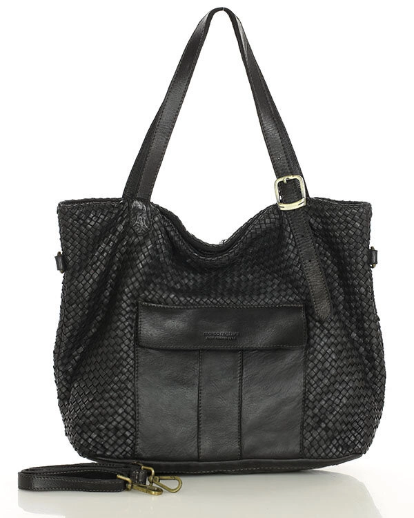 Duża torebka pleciona na ramię shopperka skórzana - MARCO MAZZINI czarna