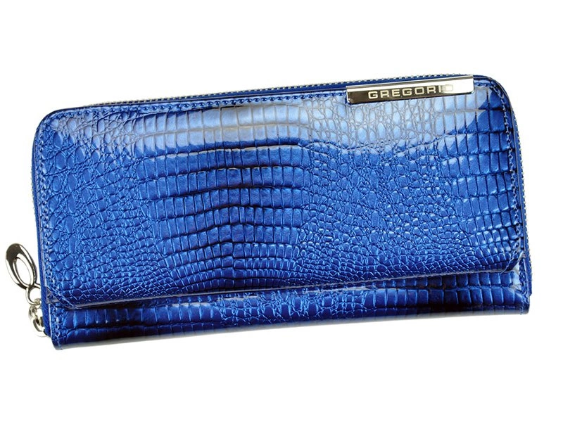 • Wyjątkowo pakowany, duży portfel od marki Gregorio. Świetne wykończenie ze skóry lakierowanej z pięknym motywem skóry węża, krokodyla. Srebrne zdobienia podkreślają wyrazistość i dodają temu modelowi eleganckiego i gustownego charakteru.