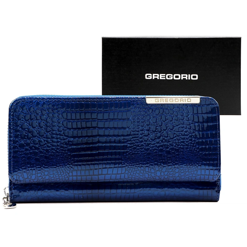 • Wyjątkowo pakowany, duży portfel od marki Gregorio. Świetne wykończenie ze skóry lakierowanej z pięknym motywem skóry węża, krokodyla. Srebrne zdobienia podkreślają wyrazistość i dodają temu modelowi eleganckiego i gustownego charakteru.