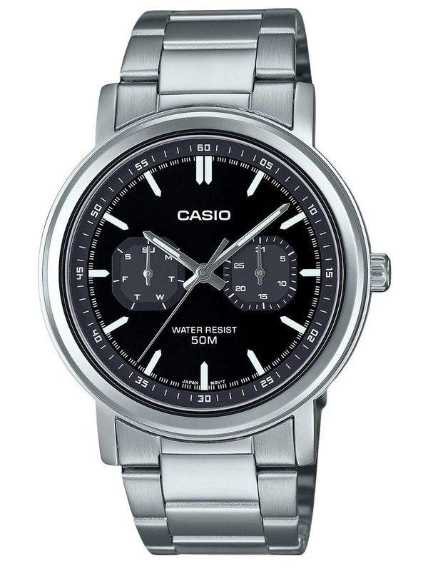 Zegarek męski CASIO MTP-E335D-1E to harmonijne połączenie klasycznej elegancji i nowoczesnej funkcjonalności, które sprawia, że ten model staje się idealnym wyborem dla mężczyzn ceniących sobie styl, niezawodność i uniwersalność. Jego okrągła, stalowa koperta w srebrnym odcieniu emanuje ponadczasowym designem, a jednocześnie prezentuje się niezwykle nowocześnie dzięki subtelnym detalom. Tarcza zegarka, utrzymana w stonowanej, czarnej kolorystyce, została ozdobiona srebrnymi indeksami oraz smukłymi wskazówkami, które zapewniają doskonałą czytelność czasu. Subtelny akcent w postaci funkcji datownika oraz chronografu dodaje zegarkowi praktycznego charakteru, czyniąc go nie tylko stylowym, ale i funkcjonalnym dodatkiem, który zawsze przypomni Ci o ważnych terminach.