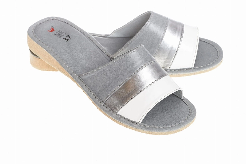Kapcie osadzono na klinie o wysokości 2,5 cm, który delikatnie unosi stopę, poprawiając wygodę chodzenia oraz stabilność.