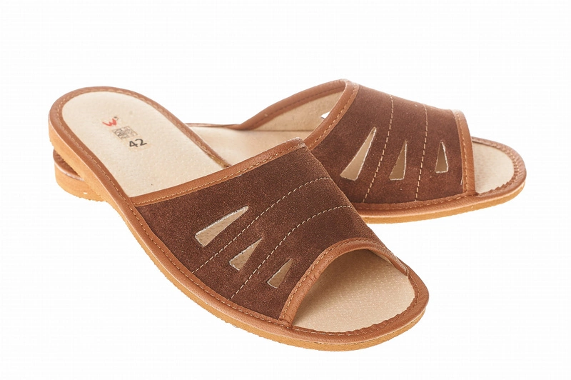 Model utrzymany jest w tradycyjnym fas­onie kapci domowych, wyposażonych w otwarty palec, dzięki czemu stopa może swobodnie oddychać. Taka konstrukcja zwiększa komfort noszenia, zwłaszcza w cieplejsze miesiące, a jednocześnie zachowuje elegancki i schludny wygląd.