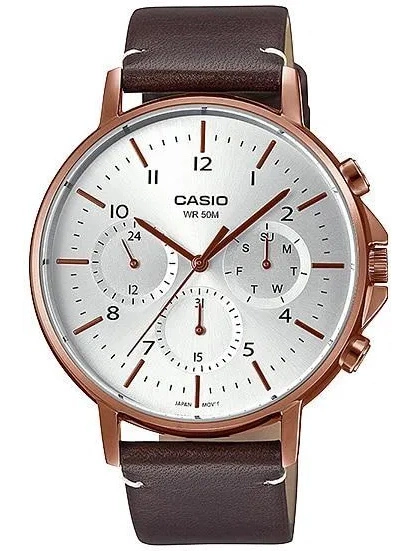 CASIO MTP-E321RL-5A to elegancki i funkcjonalny zegarek męski, który idealnie łączy klasyczny design z nowoczesnym podejściem do stylu. Jego okrągła tarcza o stonowanej kolorystyce brązu wyróżnia się wyraźnymi, dobrze widocznymi indeksami godzinowymi oraz datownikiem umieszczonym na godzinie 3. Zegarek wyposażony jest w precyzyjny mechanizm kwarcowy, zapewniający niezawodność i dokładność chodu. Koperta zegarka wykonana jest z odpornej stali nierdzewnej, co zapewnia trwałość, a skórzany pasek w odcieniu ciemnego brązu dodaje całości elegancji i komfortu noszenia. Zegarek doskonale sprawdza się w codziennych sytuacjach, jak i w bardziej formalnych okolicznościach, będąc świetnym wyborem dla mężczyzn szukających uniwersalnego, a zarazem stylowego akcesorium. CASIO MTP-E321RL-5A to doskonały wybór dla osób, które cenią sobie klasykę w połączeniu z niezawodnością.