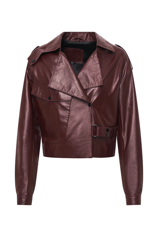 - Skórzana kurtka damska o koszulowym kroju, w eleganckim wiśniowym kolorze. Łączy klasykę z nowoczesną prostotą, idealna na wiosenno-jesienne dni bądź letnie wieczory. Subtelna, ale wyrazista w formie. Zapraszamy do zakupów.