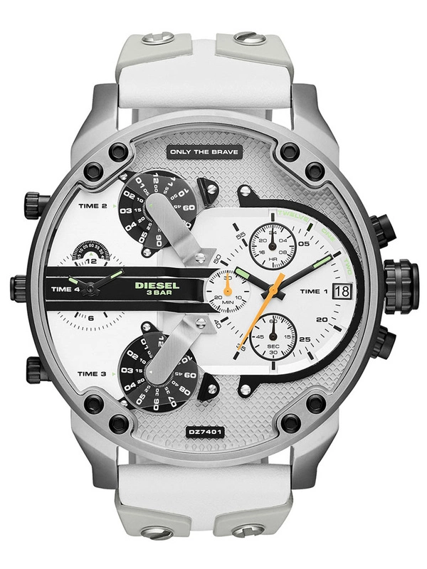 Zegarek męski Diesel Mr. Daddy 2.0 DZ7401 to duży męski zegarek. Biało szary skórzano gumowy pasek doskonale komponuje się ze srebrną kopertą, którą wykonano z hipoalergicznej stali szlachetnej. Na tarczy zamontowano 4 oddzielne mechanizmy mierzenia czasu. Całość pokryta szkłem mineralnym gwarantuje wytrzymałość na zarysowania i pęknięcia. Wodoodporność na 30 metrów chroni przed zachlapaniem. Zastosowany mechanizm kwarcowy jest niezawodny. Model Diesel Mr. Daddy 2.0 DZ7401 to połączenie niewymuszonej elegancji ze sportowym charakterem - musi przyciągać uwagę!