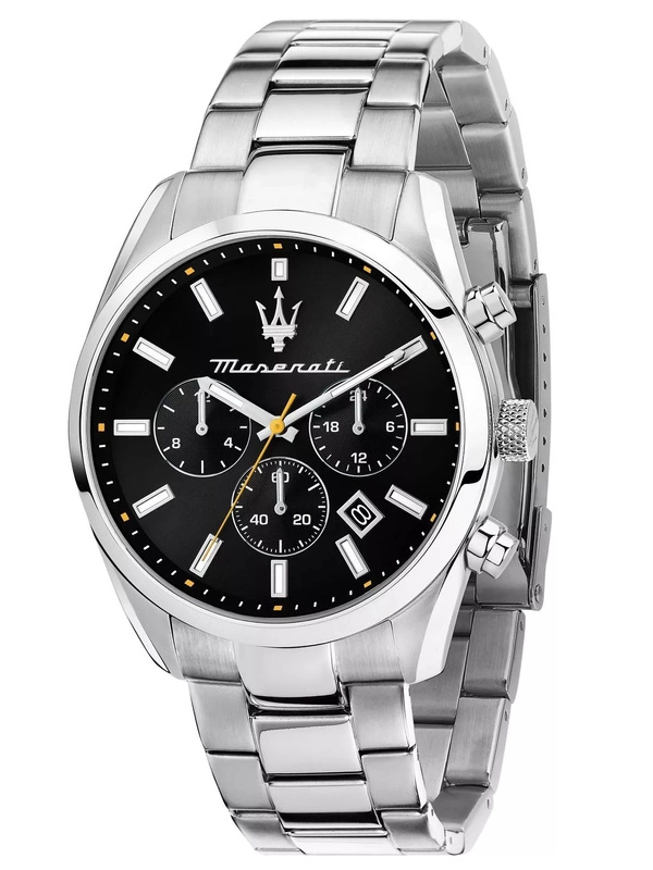Zegarek Maserati R8853151010 to elegancki i nowoczesny zegarek męski. Na czarnej tarczy ze srebrnym indeksami zabezpieczonej mineralnym szkłem znajdziemy datownik wskazujący dzień miesiąca oraz subtarcze będące wskazaniami chronografu i czasu dobowego.