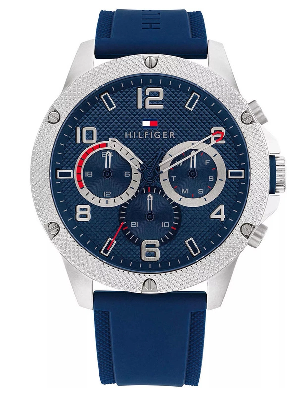 Zegarek Tommy Hilfiger 1792027 to połączenie męskiej elegancji i sportowego luzu. Duża, niebieska tarcza podkreślona stalową kopertą i komfortowy silikonowy pasek tworzą nowoczesną i uniwersalną kompozycję. Kwarcowy mechanizm oraz wodoszczelność 5 ATM sprawiają, że ten model sprawdzi się zarówno na co dzień, jak i podczas aktywności. Minimalistyczny styl i solidne wykonanie czynią go świetnym wyborem dla mężczyzn szukających zegarka łączącego design z funkcjonalnością.