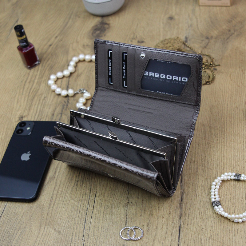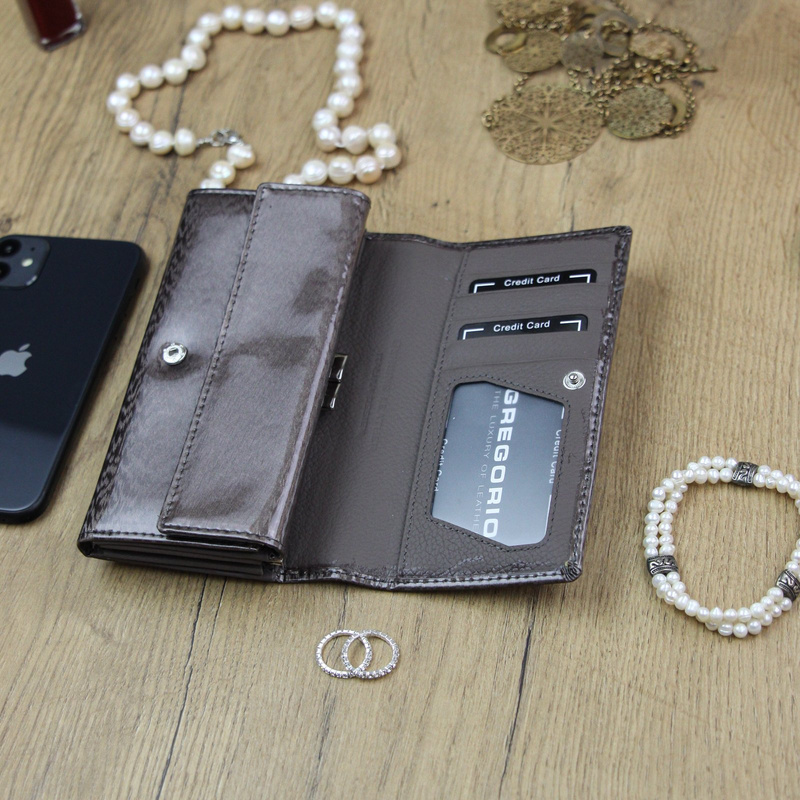 Wyjątkowy portfel, o klasycznym, podłużnym fasonie, jako propozycja od marki Gregorio. Model ten został wykonany z wysokogatunkowej skóry naturalnej, lakierowanej o przepięknym, pierwszorzędnym wzorze.