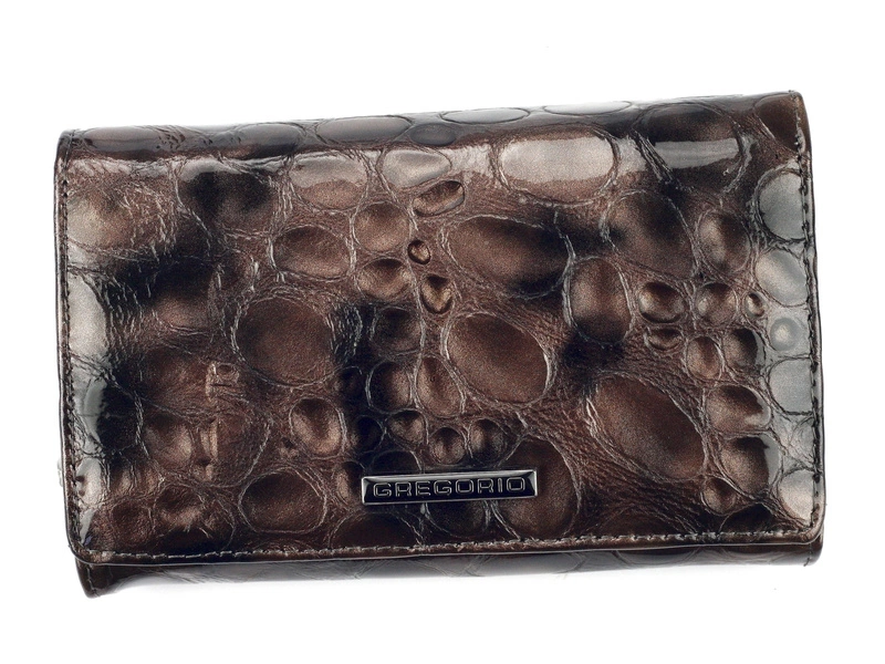 Charakterystyczny i wyjątkowy, damski portfel o klasycznym, podłużnym fasonie od marki Gregorio. Wykonanie z najlepszej, a zarazem trwałej skóry naturalnej o lakierowanym wykończeniu. Elegancji dodają stylowe obszycia wokół, wraz z logiem firmy.