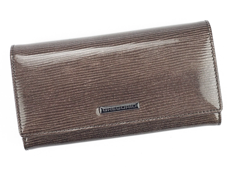 Wyrafinowany i strojny, damski portfel o klasycznym, podłużnym fasonie, wyprodukowany przez markę Gregorio. Wykonanie z solidnej, najlepszej jakości skóry naturalnej lakierowanej. Na fakturze widnieją charakterystyczne wzory, które cechują się elegancją i niepowtarzalnością.