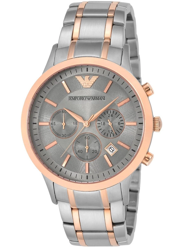 Męski zegarek Emporio Armani Renato AR11077 to klasyczny męski zegarek, idealny zarówno do eleganckiego ubioru, jak i do noszenia na co dzień. Koperta oraz bransoleta zostały wykonana ze stali szlachetnej, co gwarantuje jej wieloletnią odporność na zniszczenie. Na srebrnej tarczy zabezpieczonej mineralnym szkłem znajdziemy wyznaczniki godzin w kolorze różowego złota, datownik wskazujący dzień miesiąca oraz subtarcze będące wskazaniami chronografu.