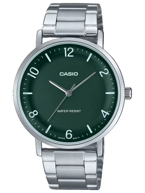 Zegarek męski CASIO MTP-VT03D-3B to połączenie klasycznej elegancji i nowoczesnej funkcjonalności, które sprawia, że każdy mężczyzna poczuje się wyjątkowo. Ten model to prawdziwy hołd dla minimalistycznego designu – jego okrągła, zielona tarcza z subtelnymi srebrnymi wskazówkami i indeksami emanuje spokojem i wyrafinowaniem. Delikatna srebrna koperta dodaje mu odrobiny luksusu, czyniąc go idealnym dodatkiem zarówno do garnituru, jak i casualowych stylizacji. To zegarek, który nie tylko pokazuje czas, ale także opowiada historię Twojego dobrego gustu.