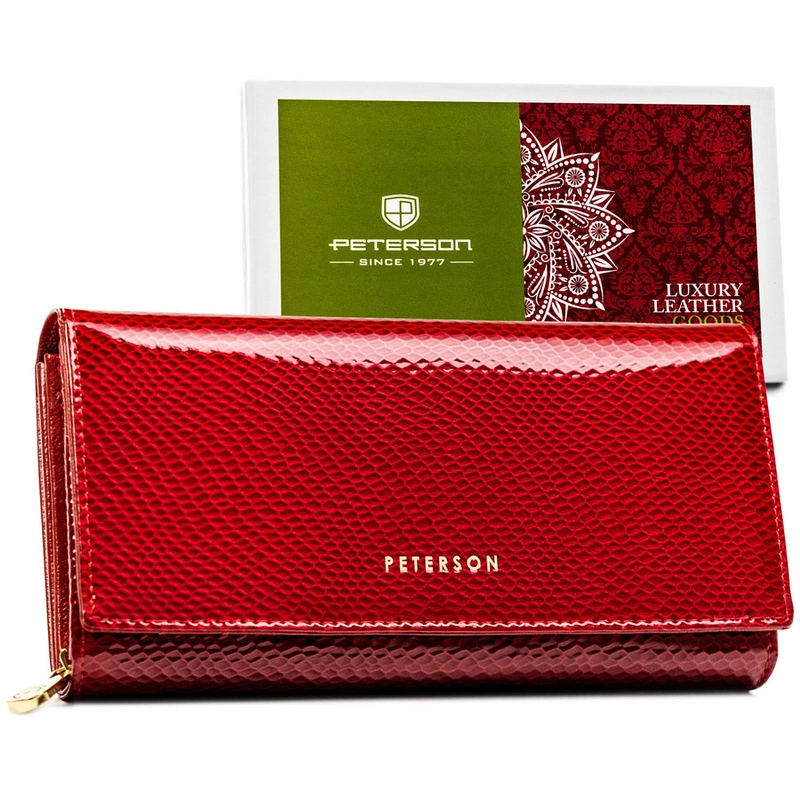 Skórzany, czerwony portfel damski ze wzorem imitującym gadzią skórę, zamykany na zatrzask - Peterson