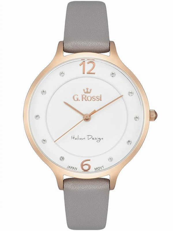 Zegarek damski G. ROSSI G.R10411A-3B4 to elegancka propozycja na co dzień, która łączy subtelną kobiecość z wyjątkowym stylem. Z szarym paskiem ze skóry, kopertą w różowym złocie i białą tarczą, prezentuje się bardzo szykownie. Indeksy na tarczy to delikatne kryształki, które dodają mu blasku i finezji. Zegarek posiada wodoodporność na poziomie WR30, co zapewnia komfort użytkowania w codziennych sytuacjach. Idealny wybór dla kobiet ceniących elegancję, ale szukających także praktyczności w swoich dodatkach.