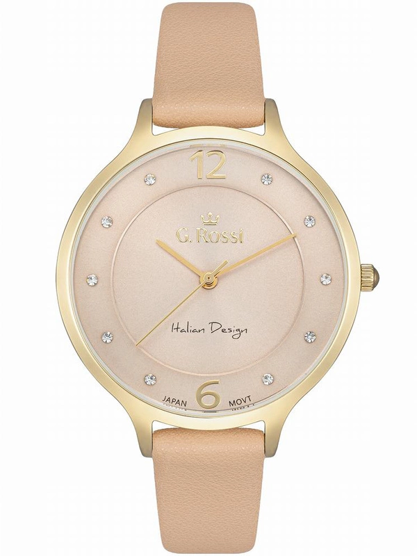 Zegarek damski G. ROSSI G.R10411A-2B2 to elegancka propozycja na co dzień, która łączy subtelną kobiecość z wyjątkowym stylem. Z beżowym paskiem ze skóry, kopertą w złotym odcieniu i beżową tarczą, prezentuje się bardzo szykownie. Indeksy na tarczy to delikatne kryształki, które dodają mu blasku i finezji. Zegarek posiada wodoodporność na poziomie WR30, co zapewnia komfort użytkowania w codziennych sytuacjach. Idealny wybór dla kobiet ceniących elegancję, ale szukających także praktyczności w swoich dodatkach.