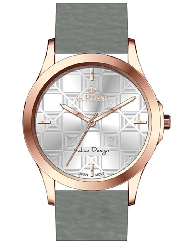 Zegarek damski G. ROSSI G.R10513A-3B4 to elegancka propozycja na co dzień, która łączy subtelną kobiecość z wyjątkowym stylem. Z szarym paskiem ze skóry, kopertą w odcieniu różowego złota i srebrną tarczą, prezentuje się bardzo szykownie. Indeksy na tarczy w kolorze różowego złota, które dodają mu blasku i finezji. Zegarek posiada wodoodporność na poziomie WR30, co zapewnia komfort użytkowania w codziennych sytuacjach. Idealny wybór dla kobiet ceniących elegancję, ale szukających także praktyczności w swoich dodatkach.