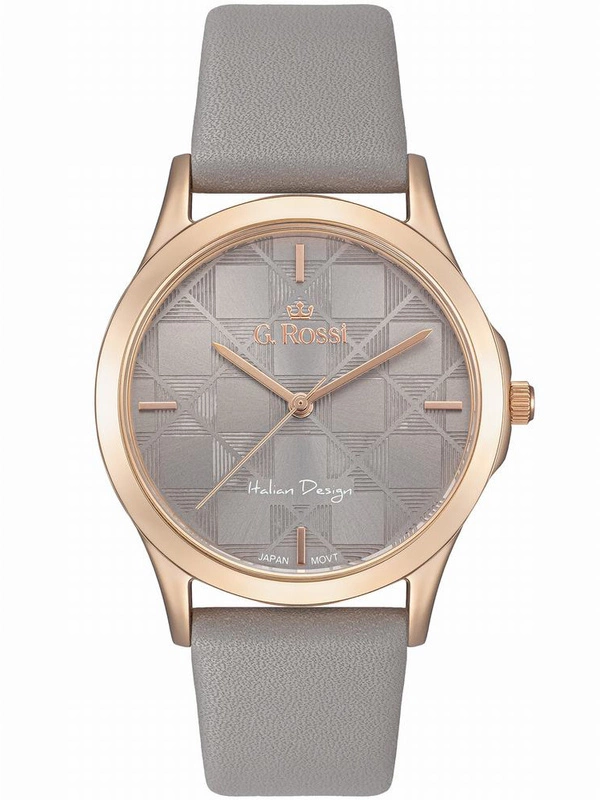Zegarek damski G. ROSSI G.R10513A-1B3 to elegancka propozycja na co dzień, która łączy subtelną kobiecość z wyjątkowym stylem. Z szarym paskiem ze skóry, kopertą w odcieniu różowego złota i szarą tarczą, prezentuje się bardzo szykownie. Indeksy na tarczy w kolorze różowego złota, które dodają mu blasku i finezji. Zegarek posiada wodoodporność na poziomie WR30, co zapewnia komfort użytkowania w codziennych sytuacjach. Idealny wybór dla kobiet ceniących elegancję, ale szukających także praktyczności w swoich dodatkach.