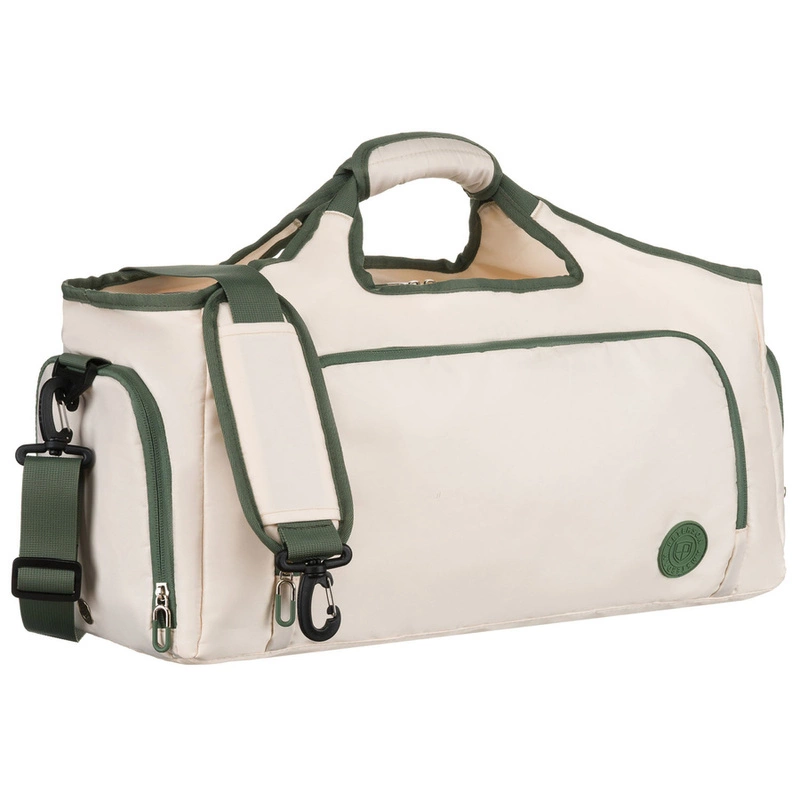 - Torba weekendowa w kolorach ecru i zielonym, zrobiona z wytrzymałego poliestru. Posiada oddzielą komorę na buty z wywietrznikiem. Torba z wodoodporną komorą termiczną, wyposażona w uchwyt na walizkę. W zestawie odpinany, regulowany pasek.