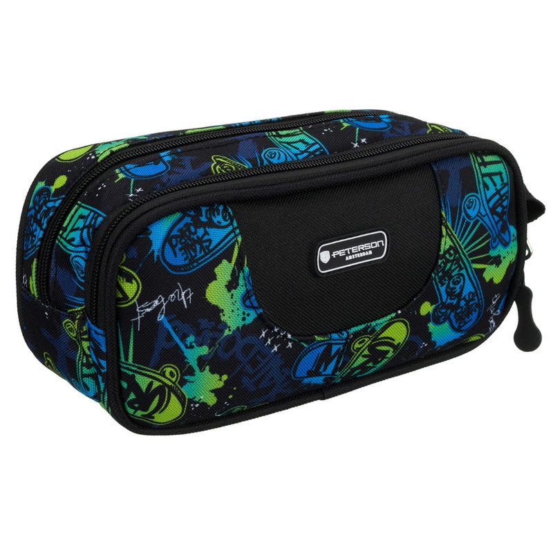 Dwukomorowy piórnik szkolny z poliestru pokryty wzorem w deskorolki - Peterson