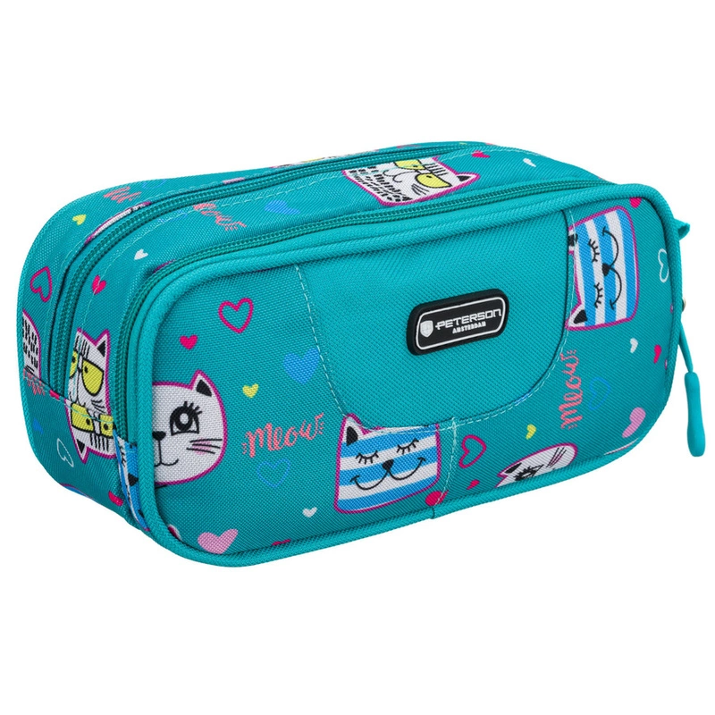 Dwukomorowy piórnik szkolny z poliestru, ozdobiony wzorem w kotki - Peterson