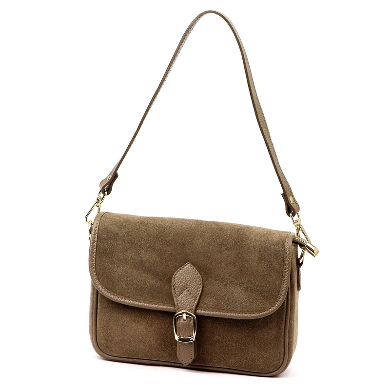 Ta wyjątkowa torebka Vera Pelle to połączenie elegancji i praktycznego charakteru. Wykonana z wysokiej jakości naturalnej skóry zamszowej, wyróżnia się subtelnym wyglądem, który dodatkowo podkreślają złote okucia. Jej minimalistyczny design bez wzorów sprawia, że doskonale uzupełnia zarówno codzienne, jak i bardziej eleganckie stylizacje.