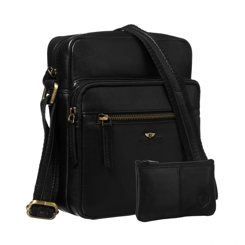Miejska, czarna torba męska ze skóry naturalnej zawieszona na regulowanym pasku - Peterson