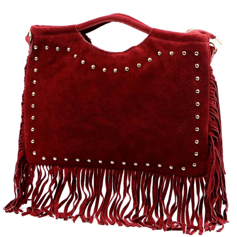 Zamszowa pojemna Damska skórzana torebka do ręki z frędzlami i dżetami Luka