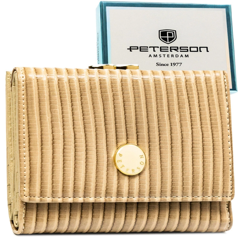 Beżowy, prążkowany portfel damski ze skóry naturalnej i ekologicznej - Peterson