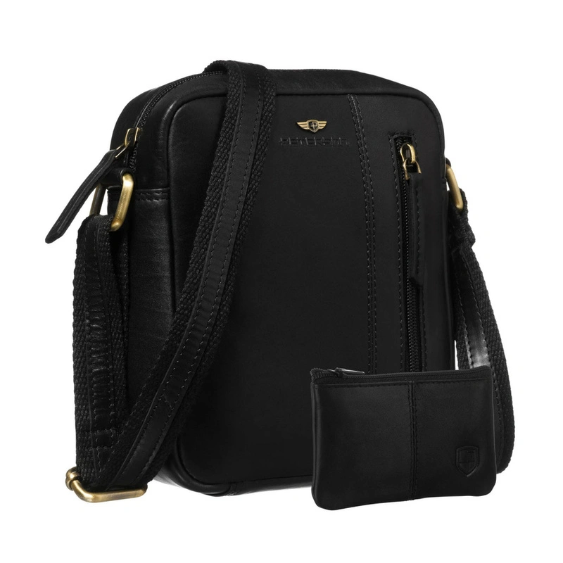 - Czarna torba męska wykonana ze skóry naturalnej. Mała, ale pojemna - ma 4 praktyczne kieszenie. Zawieszona na wygodnym, regulowanym pasku i zamykana suwakiem. Wszystkie okucia mają piękny, złoty kolor.