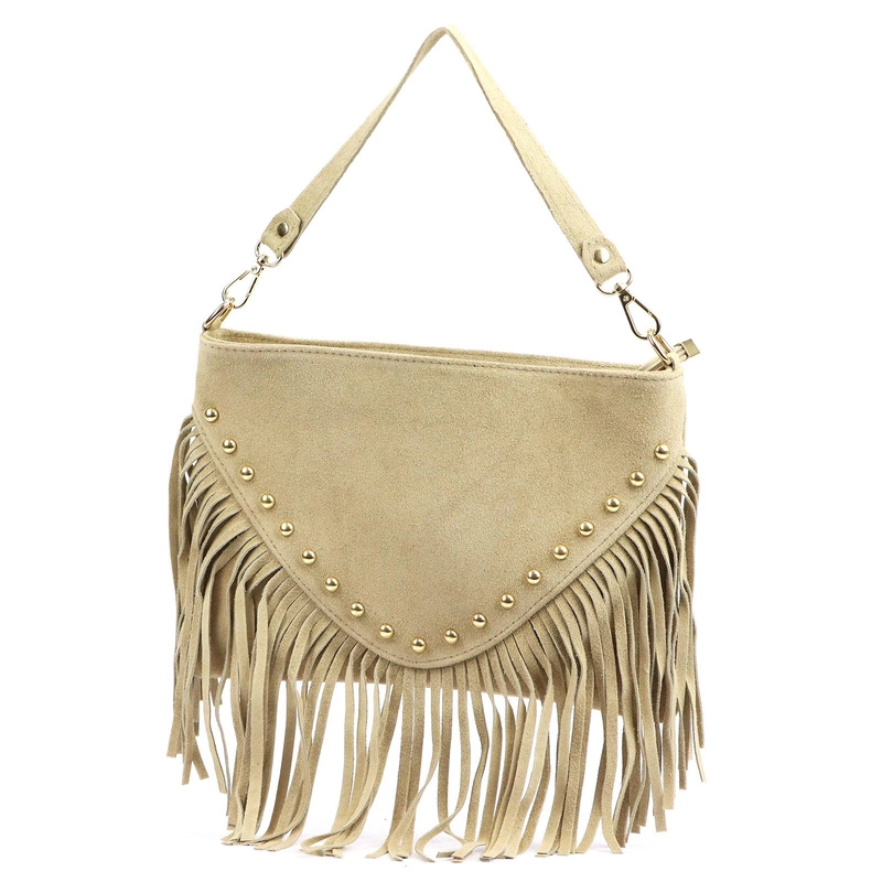 Skórzana zamszowa damska listonoszka z frędzlami i dżetami na ramię Luka