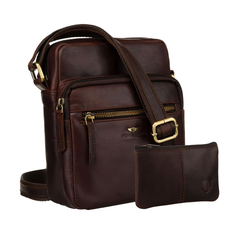 - Elegancka torebka męska Peterson, wykonana ze skóry naturalnej w brązowa kolorze. Praktyczna listonoszka z zamkiem błyskawicznym, regulowanym paskiem i licznymi kieszeniami. W zestawie mała saszetka na klucze.