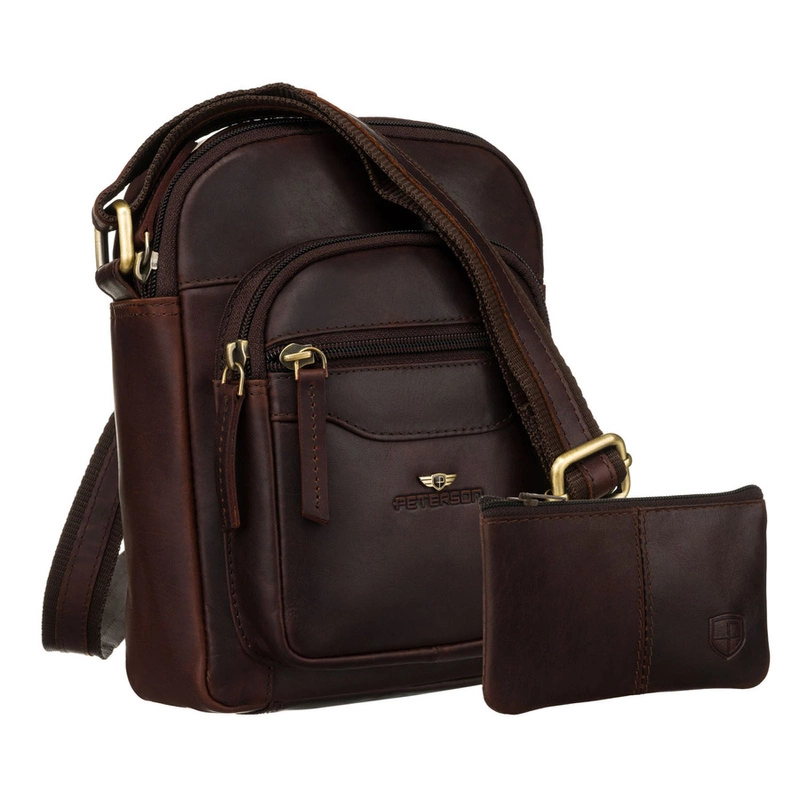 - Męska listonoszka Peterson z naturalnej skóry w brązowym kolorze, idealna na co dzień. Posiada pojemną komorę główną, kieszenie na suwak, regulowany pasek na ramię i elegancki design. Doskonałe połączenie stylu i funkcjonalności.