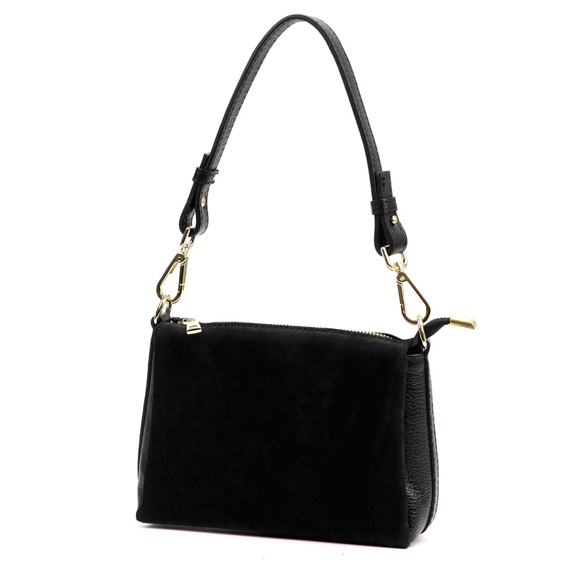 Wykonana z zamszowej skóry naturalnej, torebka wyróżnia się delikatną fakturą i miękkim w dotyku wykończeniem. Złote elementy i dopracowane detale podkreślają jej luksusowy charakter, dzięki czemu idealnie pasuje do zarówno codziennych, jak i eleganckich stylizacji.