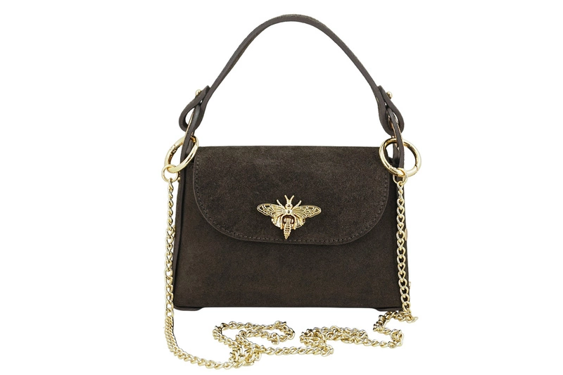 Wnętrze torebki: modne zamszowe torebki wizytowe z ozdobnym zapięciem oraz złotymi nitami są jednokomorowe, surowo wykończone. Posiadają złote okucia, krótki uchwyt do ręki (długość 25cm, wysokość 11cm, szerokość 1,8cm) oraz doczepiany złoty łańcuszek (długość 110cm, wysokość 58cm). Uniwersalny fason, rozmiarowo idealny aby pomieścić niezbędne rzeczy - telefon, portfel oraz drobne kosmetyki. Wyjątkowe zamszowe torebki wizytowe są dostępne w szerokiej palecie kolorów - wybierz idealny dla Ciebie i wyróżnij stylizację torebką z naszego sklepu - w najnowszej kolekcji znajdziesz wiele modeli torebek skórzanych, plecaków oraz torebek klasycznych.