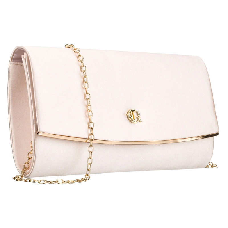 • Beżowa kopertówka damska z tkaniny syntetycznej wyposażona w wewnętrzną kieszonkę. Zawieszona na złotym łańcuszku, który dodaje biżuteryjnego charakteru. Jednokomorowa, zapinana klipsem magnetycznym.