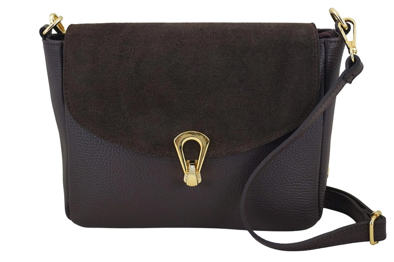 Torebka Barberinis ze złotym zapięciem w kolorze ciemnego brązu została wykonana ze skóry licowej w połączeniu ze skórą zamszową. Elegancja w najlepszym wydaniu - wyjątkowa torebka Barberinis ze złotym zapięciem wykonana została z wysokiej jakości skóry naturalnej, a jej front zdobi miękka zamszowa klapka, która dodaje całości subtelnego charakteru. Stylowe, złote zapięcie podkreśla ponadczasowy design i nadaje torebce szykownego wykończenia. W ofercie naszego sklepu znajdziesz wiele modeli funkcjonalnych torebek listonoszek, na długim regulowanym pasku, w szerokiej palecie kolorów, z delikatnymi złotymi lub srebrnymi ozdobami. Zapoznaj się z najnowszą ofertą torebek skórzanych dostępnych w naszym sklepie - listonoszek, klasycznych lub wygodnych plecaków oraz portfeli.