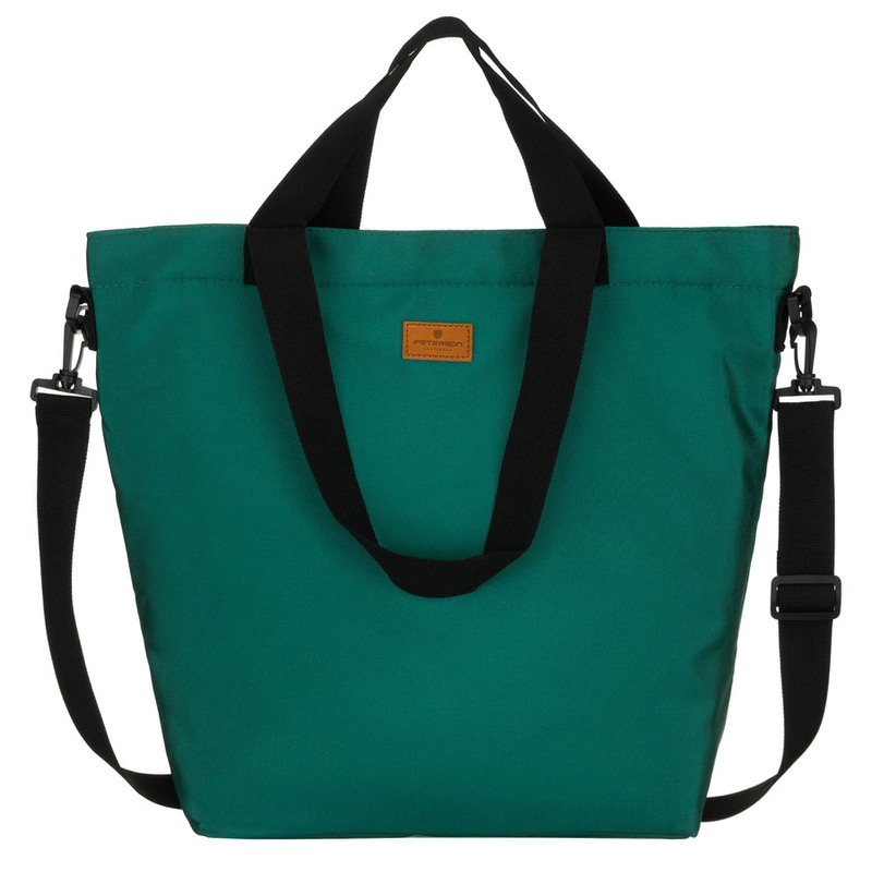 Duża, ciemnozielona shopperka damska z poliestru, zawieszona na uchwytach i doczepianym pasku - Peterson