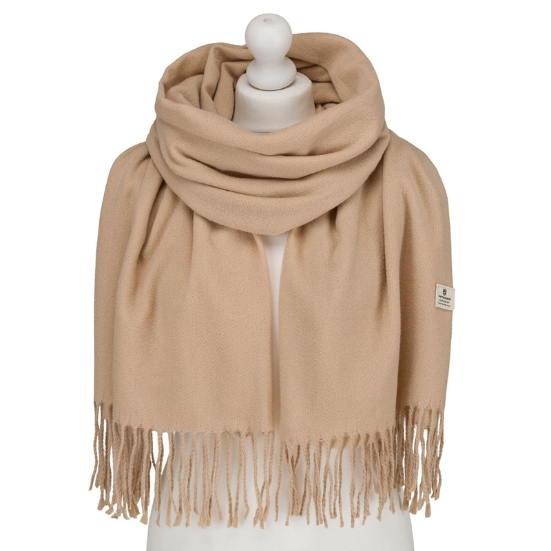 - Stylowy, beżowy szalik damski, dwustronny. Idealny na zimę, jesień i wiosenne chłody. Wykonany z wysokogatunkowego poliestru. Pasuje zarówno do eleganckiego płaszcza, jak i do casualowej kurtki. Szalik ze stylowymi frędzlami.