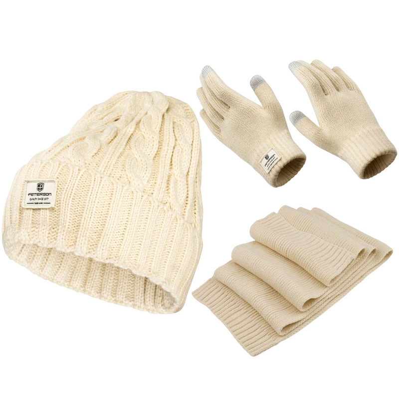 Zestaw: czapka, rękawiczki i szalik w jasnym, beżowym kolorze - Peterson