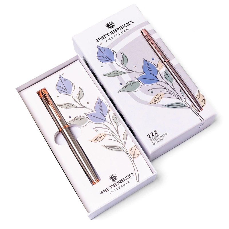 Długopis zapakowany jest w eleganckie pudełko prezentowe z delikatnym, roślinnym motywem graficznym. To idealny upominek dla osób, które cenią styl, elegancję i funkcjonalność – sprawdzi się jako prezent firmowy, dla nauczyciela, studenta lub partnera biznesowego.