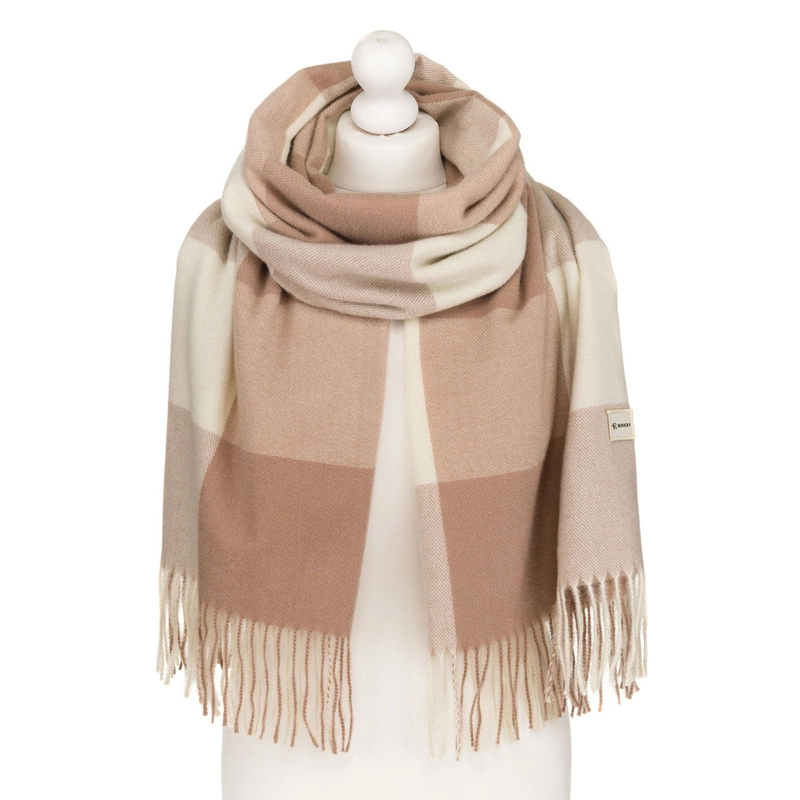 Duży, jasnobrązowy szal damski ozdobiony frędzlami - Rovicky