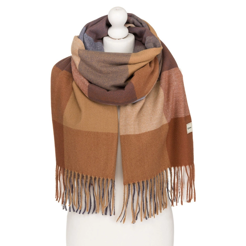 - Brązowy, dwustronny szalik damski z frędzlami. Wykonany z miękkiego poliestru. Perfekcyjnie komponuje się z płaszczem, kurtką czy swetrem. Idealny na zimowe spacery.