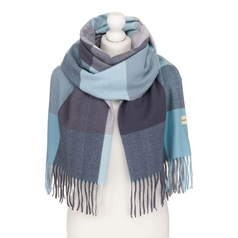 - Niebieski, dwustronny szalik damski z frędzlami. Wykonany z miękkiego poliestru. Perfekcyjnie komponuje się z płaszczem, kurtką czy swetrem. Idealny na zimowe spacery.