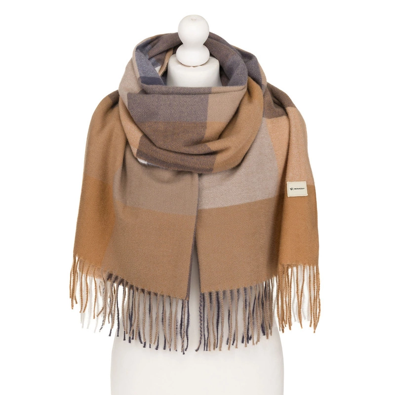 Duży, długi szal damski z poliestru w kolorze khaki ozdobiony frędzlami - Rovicky
