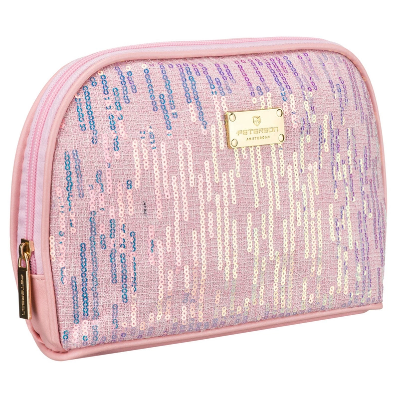 - Kosmetyczka z materiału syntetycznego w różowym kolorze, ozdobiona cekinami. Pomieści wszystkie najważniejsze kosmetyki i akcesoria. Zamykana na wygodny suwak. Jednokomorowa.
