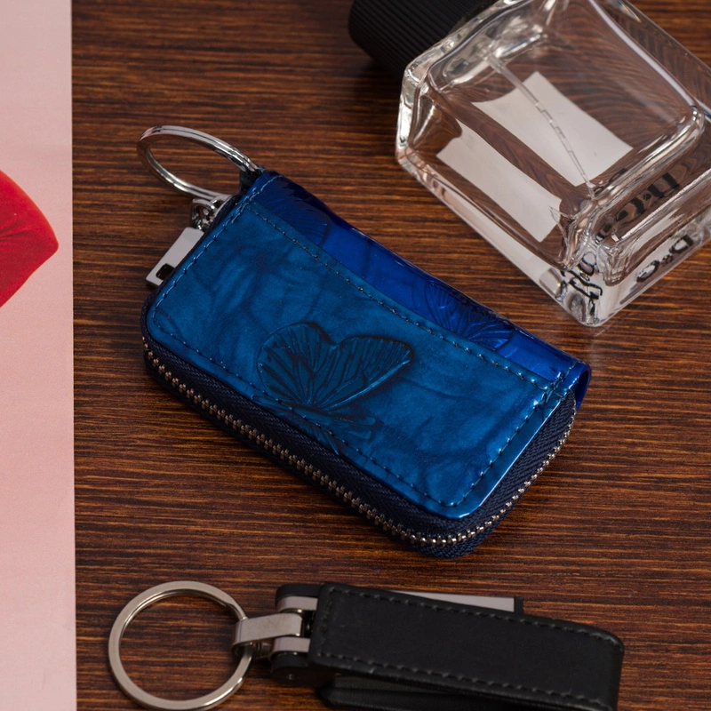 Skórzane etui na klucze skóra naturalna damskie pojemne F19 niebieskie motyle