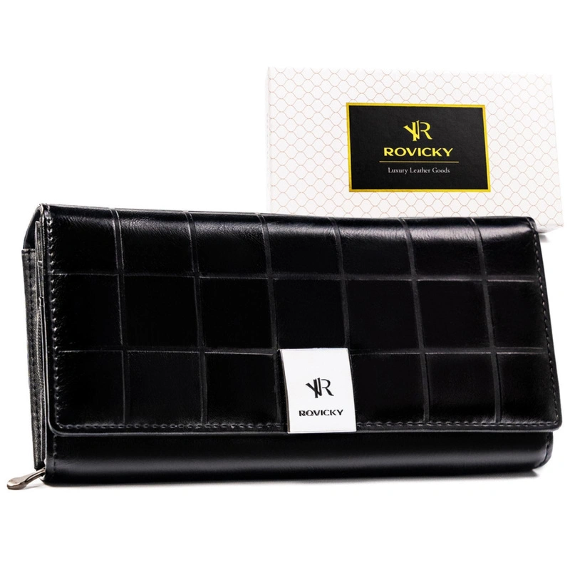 Damski portfel Rovicky to połączenie klasyki i nowoczesnego stylu. Model o poziomej orientacji wykonano z wysokiej jakości skóry naturalnej połączonej z ekoskórą, ozdabiając go efektownym wzorem pikowanych kwadratów. Całość uzupełniają srebrne okucia oraz widoczne logo producenta, które podkreślają elegancki charakter portfela.
