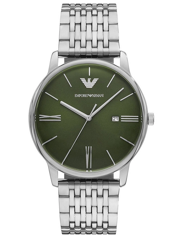 Zegarek Emporio Armani AR11644 to wyjątkowy model, który łączy nowoczesny design z eleganckim wykończeniem. Jego tarcza w kolorze zielonym z subtelnymi srebrnymi detalami nadaje mu charakteru, a stalowa koperta i bransoleta w kolorze srebrnym dodają całości klasy. Dzięki prostemu, ale eleganckiemu wyglądowi, zegarek doskonale sprawdzi się zarówno w codziennych, jak i bardziej formalnych stylizacjach, stanowiąc idealny wybór dla osób ceniących subtelną elegancję.