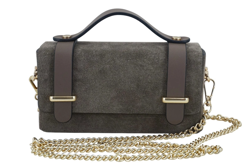 Wnętrze torebki: zamszowa torebka Barberinis wizytowa jest jednokomorowa, surowo wykończona, zapinana na dwa magnesy. Torebka posiada krótki uchwyt do ręki wykonany ze skóry licowej w dopasowanym kolorze, co dodaje jej wyrafinowanego charakteru. Subtelne złote elementy metalowe – klamry, łańcuszek oraz nity – wspaniale komponują się z całością, nadając torebce nutę luksusu. Z tyłu umieszczono ozdobne nity, które stanowią delikatny, ale efektowny akcent dekoracyjny. Dzięki złotemu łańcuszkowi (długość 126cm, wysokość 61cm) torebkę można nosić również na ramieniu lub przez ramię, co zwiększa jej funkcjonalność. Połączenie zamszu i gładkiej skóry licowej sprawia, że model ten łączy w sobie elegancję z nowoczesnym designem. Modna zamszowa torebka Barberinis wizytowa dostępna jest w kilku odcieniach brązu, beżu oraz w kolorze klasycznym czarnym.
