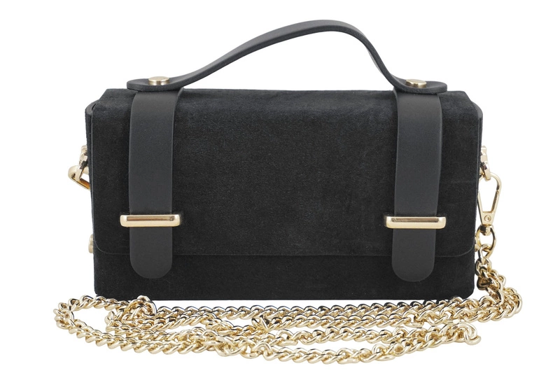 Wnętrze torebki: zamszowa torebka Barberinis wizytowa jest jednokomorowa, surowo wykończona, zapinana na dwa magnesy. Torebka posiada krótki uchwyt do ręki wykonany ze skóry licowej w dopasowanym kolorze, co dodaje jej wyrafinowanego charakteru. Subtelne złote elementy metalowe – klamry, łańcuszek oraz nity – wspaniale komponują się z całością, nadając torebce nutę luksusu. Z tyłu umieszczono ozdobne nity, które stanowią delikatny, ale efektowny akcent dekoracyjny. Dzięki złotemu łańcuszkowi (długość 126cm, wysokość 61cm) torebkę można nosić również na ramieniu lub przez ramię, co zwiększa jej funkcjonalność. Połączenie zamszu i gładkiej skóry licowej sprawia, że model ten łączy w sobie elegancję z nowoczesnym designem. Modna zamszowa torebka Barberinis wizytowa dostępna jest w kilku odcieniach brązu, beżu oraz w kolorze klasycznym czarnym.